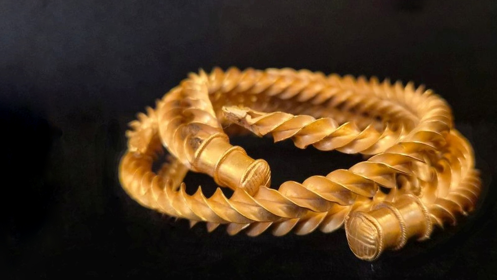 Discovered in 2024 by a local metal detectorist, the Leicestershire torc is a spectacular gold object dating to the Middle Bronze Age period, about 3,200 years ago. It was a piece of very high-status jewellery, possibly originally worn around the middle like a belt and later modified to be worn around the neck. It is the only example ever found in the county. (Article continues below image)
