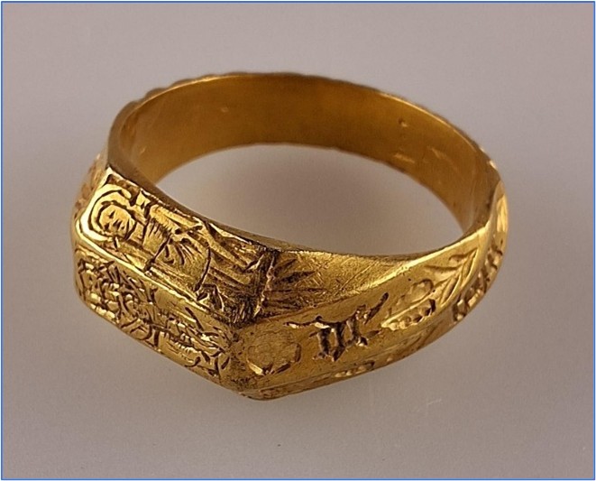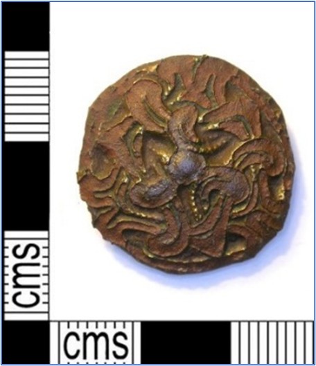 They include a Medieval gold ring, AD 1400 – 1550, from Narborough, engraved with Jesus on the cross and God above, and St John the Evangelist and the Virgin Mary either side (below left); and a Scandinavian gilded copper alloy disc brooch, AD 850-950, from Cossington (below right). The objects will find a more permanent home in Charnwood Museum over the coming years.